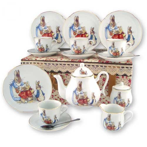 Helen Beatrix Potter (28 July 1866 - 22 December 1943) was an English author, illustrator, mycologist and conservationist who was best known for her many best-selling children's books that featured animal characters, such as Peter Rabbit. Ruetter Porcelain's licensed porcelain products include many of the characters from her historic stories. Featuring hand-applied, high-quality printed decals that are fired at 1500° F making them permanent, food safe & dishwasher friendly. Most component items also include real 24k gold rims. This Beatrix PotterTM set is not only functional, but an heirloom collectible that will be cherished for generations.Two classic favorites, tea parties and Beatrix Potter's Peter Rabbit, come together in this delightful 4 piece place setting for 4 tea service set is hand made of quality Reutter Porcelain from Germany.This classic set features Flopsy, Mopsy, Cottontail, Peter and their mother. Each licensed porcelain piece is hand-finished in 22k gold and as in all Reutter tea services, it is food & dishwasher safe! Perfect for your kids tea parties and comes packed in a custom fabric covered side hamper boxCheap "Beatrix Potter's Peter Rabbit Large Tea Set in Custom Fabric Side Hamper Box with Peter Rabbit Plush" Discount Review Shop