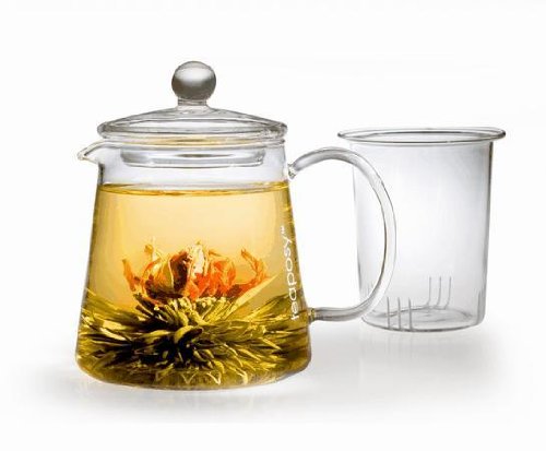 The 16 oz, hand-blown Tea for Two teapot features a removable glass tea infuser, and is the perfect way to watch your roses bloom.