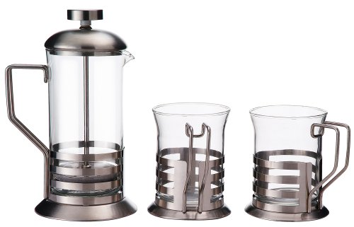 Many coffee aficionados believe the French-press plunger method of brewing is the best way to bring out the richest flavor of the beans. This small coffee press from Primula employs that method to brew about three cups of aromatic coffee. To use, simply put medium-to-coarse ground coffee in the bottom of the container, add hot (not boiling) water, wait approximately three minutes, and slowly press down the plunger with the stainless-steel mesh filter. All the grounds will be captured below the filter, leaving the coffee ready to pour and enjoy.Designed with striking stainless-steel holders that feature four parallel bars and angular handles, the coffee maker and two matching cups make a great gift for someone who appreciates the modern look. Unlike some presses that use polycarbonate containers, this set is made with glass inserts that can be removed from the stainless-steel holders for easy cleaning. The model number of this set is PCP-1203. --Ann Bieri